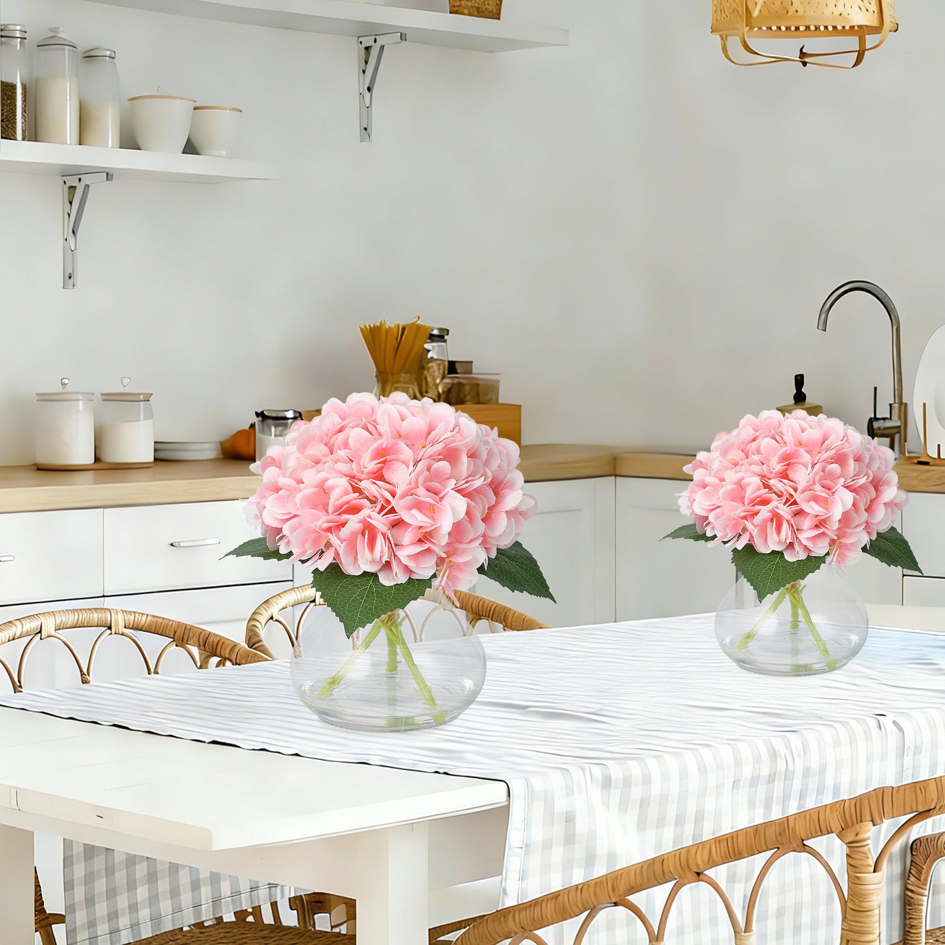 The asfatedge faux hydrangea flower arrangement brings timeless elegance and natural beauty to your space without any maintenance. Made with realistic silk hydrangea blooms, natural-looking green stems, and a clear glass vase filled with faux water, this arrangement delivers a fresh, lifelike appearance from every angle.